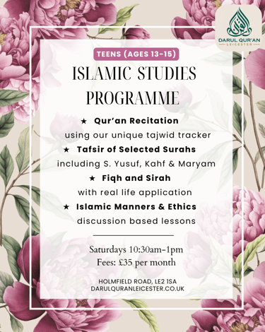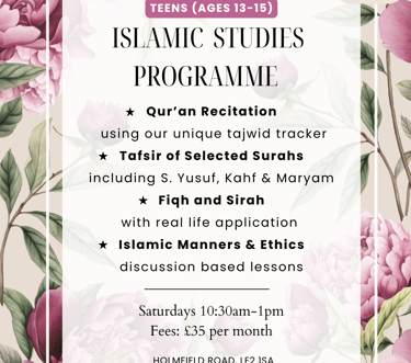 Designed to inspire and nurture teenage girls in their journey of faith. Through engaging classes, students will strengthen their Qur’an recitation, explore the meanings of selected surahs, and learn practical fiqh for daily life. They will also study the sīrah of the Prophet ﷺ and develop strong Islamic manners and ethics.