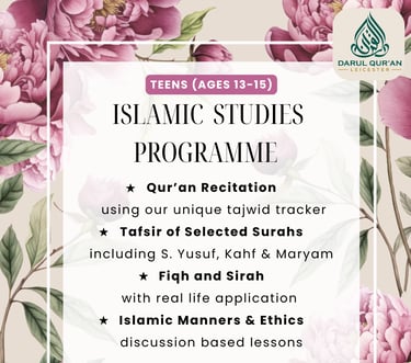 Designed to inspire and nurture teenage girls in their journey of faith. Through engaging classes, students will strengthen their Qur’an recitation, explore the meanings of selected surahs, and learn practical fiqh for daily life. They will also study the sīrah of the Prophet ﷺ and develop strong Islamic manners and ethics.