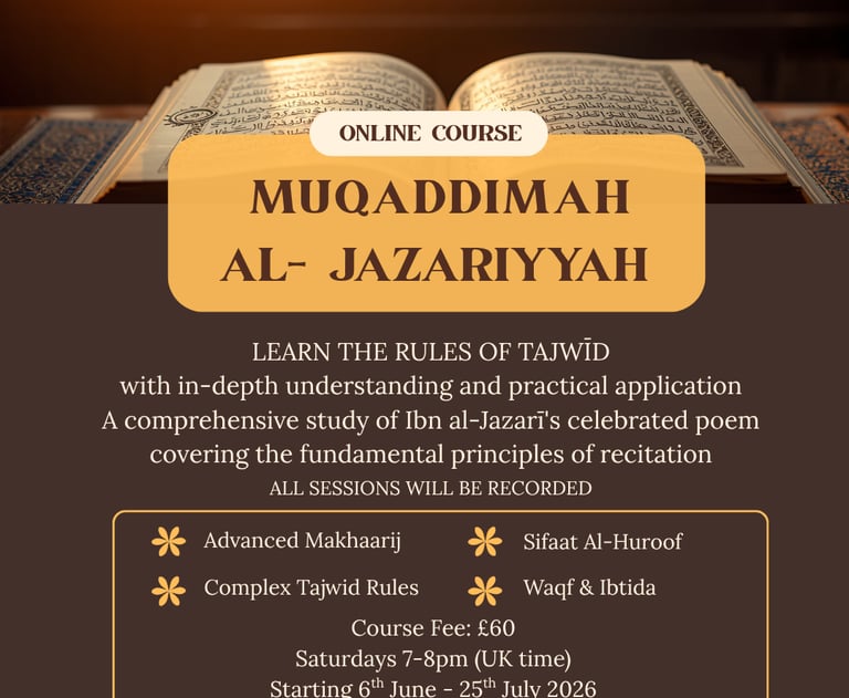 This course offers a comprehensive study of the Muqaddimah al-Jazariyyah, a foundational text in the science of Tajwid studied by students of Qur’an across the world. Through guided explanation and practical application, students will gain a deeper understanding of articulation, letter characteristics, and the precision required in reciting the Qur’an. Designed to develop both knowledge and proficiency, this programme is ideal for those seeking to refine and elevate their recitation.